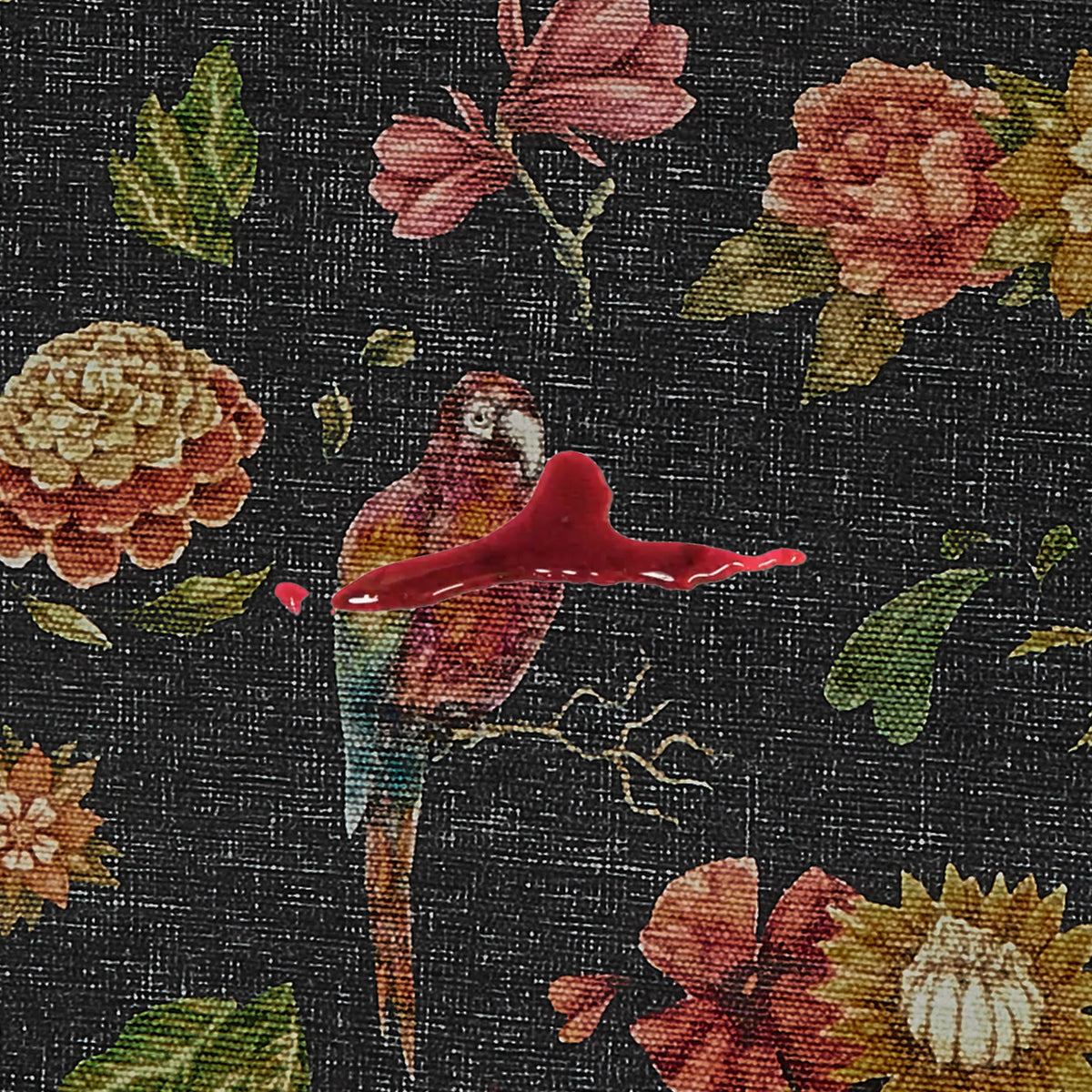 Sand background is subtly textured to add depth and color variances. Florals and trailing vines with leaves are colors you would find in nature; soft grass green, light gold, hints of brown, brick red with mid-toned blue accents.