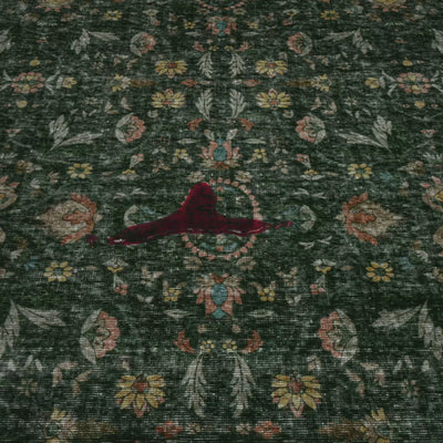 Deep forest green background with multi-colored motifs. Floral elements are terracotta, brick red, blue, and yellow, while the leaves are taupe, grey, and shades of lighter green. The ivory distressing creates a unique vintage look for this rug.